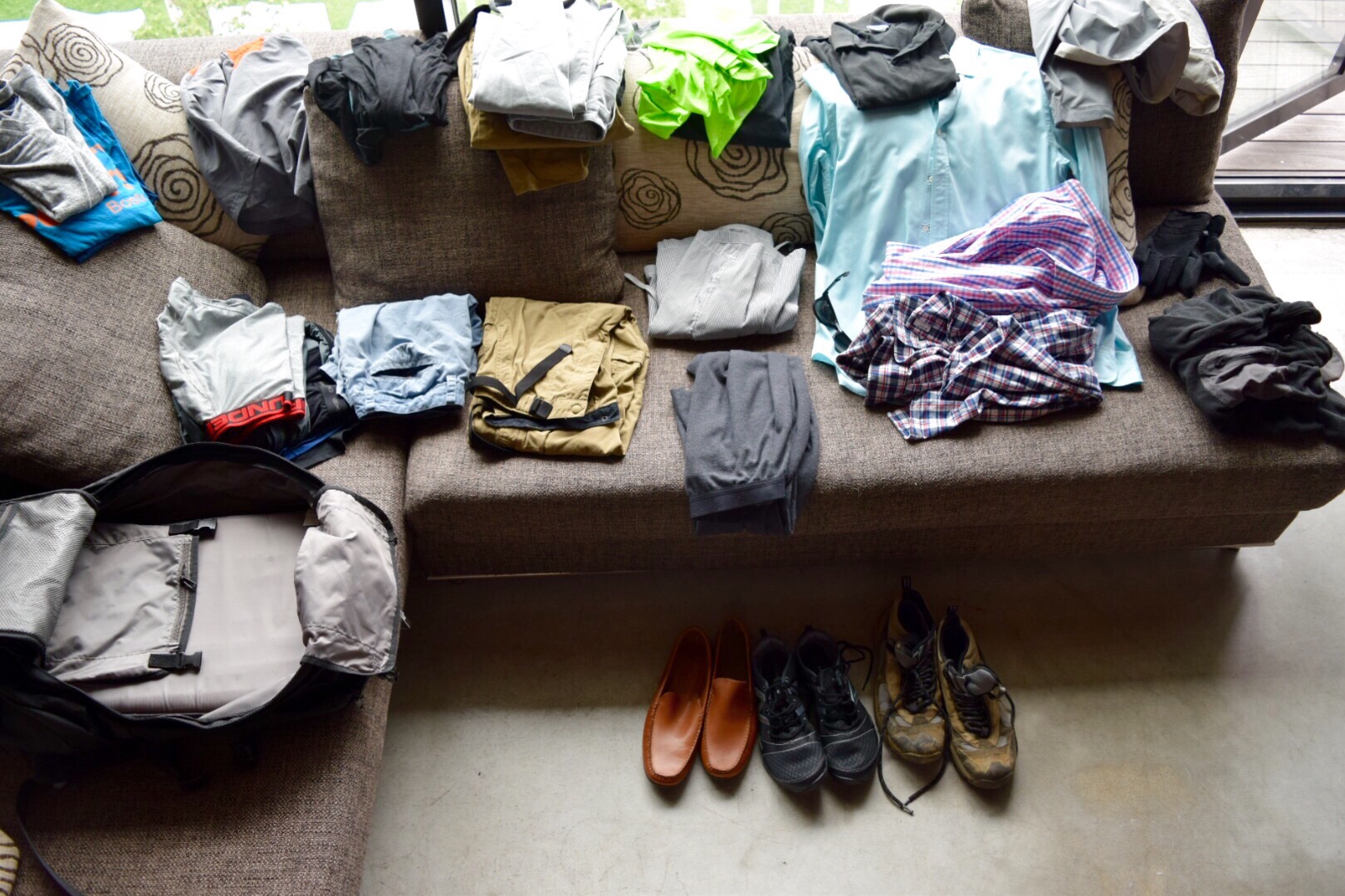 Jesse: 3 button downs, hiking pants, 2 regular pants, gym shorts, regular shorts, 2 tech tees, 2 long sleeve tech shirts, 2 t-shirts, polo shirt, swim trunks, jeans, long johns, undergarments, fleece, rain shell, red sox hat, fleece hat, gloves, hiking boots, trail runners, flip flops, moccasins.