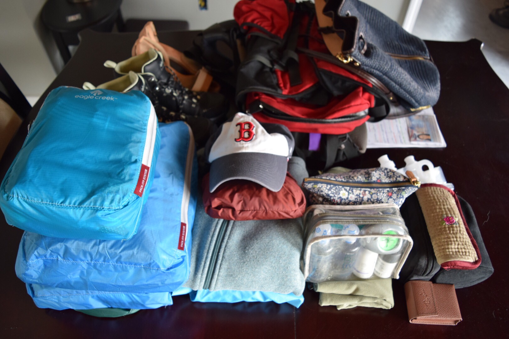 My pile (note compartmentalization with packing cubes):