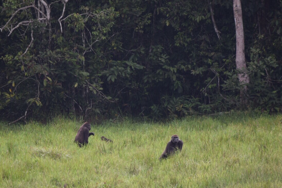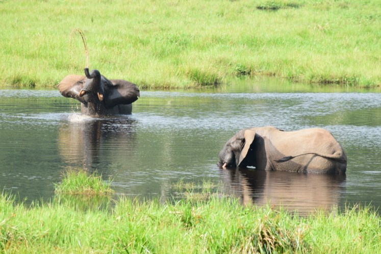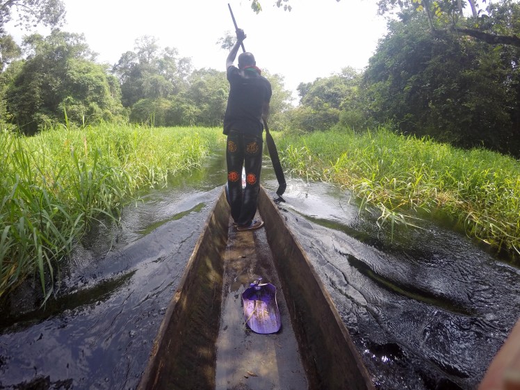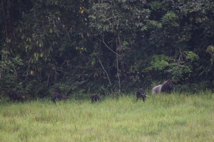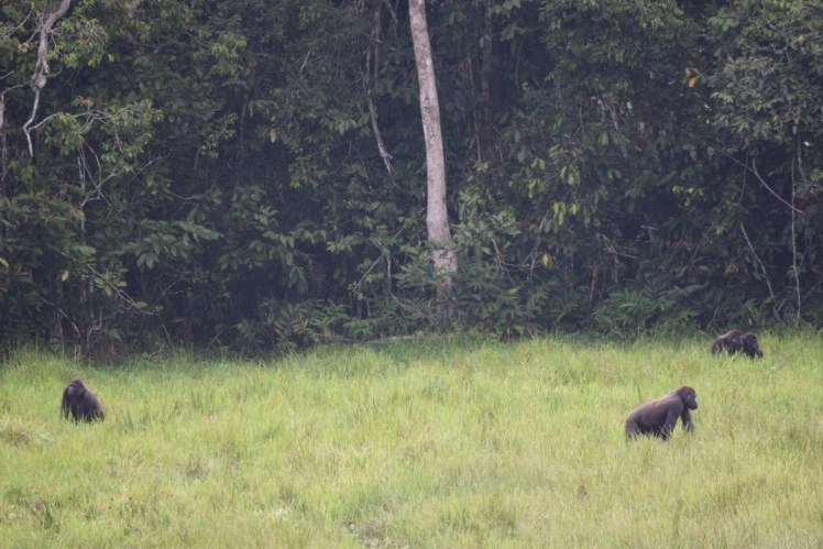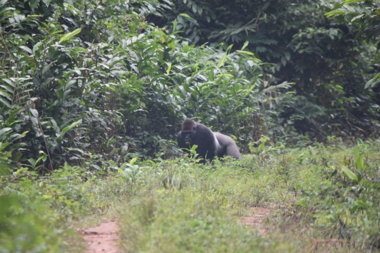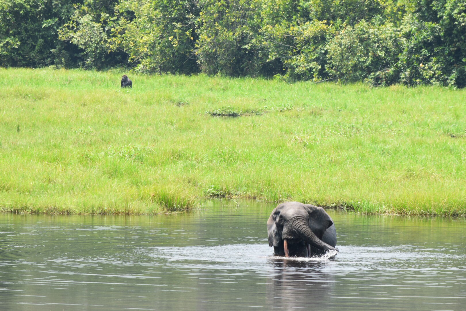 The next morning, we started off bright and early to hitch a ride with some researchers on an hour long drive into the park. Almost immediately we got some wildlife viewing with a solitary gorilla and a family of giant forest hog hanging out in the road.The research director told us we were incredibly lucky and that “researchers are here for months and years and never see anything like this” as she got out to take dung samples. Our good fortune continued throughout our stay.The original plan was to stay near the Bai at Mbeli camp, but a trouble making elephant nicknamed Bart had been wrecking havoc there. He removed the roof of the tourist huts because he enjoyed eating clothes and bars of soap. Plan B was a camp further away at Ndoki which involved an hour long pirogue ride, oared by Ba’aka (the indigenous people of the area), followed by a 45 minute hike to the bai twice a day.This Bart driven turn of events proved fortunate, as our pirogue and forest walks were quite eventful! We saw a horde of red river hog, a few blue duiker (like deer), a couple different monkey groups, and some partridge. Thank you Bart, for your incorrigibility.Over the two days at the Bai viewing platform our luck continued. We saw five elephants, which interestingly are numbered instead of named, unlike gorilla which are given kooky names with a theme for each group. We were hoping these two elephants, finding themselves at the Bai at the same time, would interact more, but they just looked at each other and sprayed some water around.We saw a total of six gorilla families (George, Conan, Morpheus, Bomba, Saha, and Stockwell) plus 2 solitary silverbacks (Louie and Lyle).  This was a boon for Marie and Valerie, the researchers, as they furiously took notes and recorded behaviors. After the dust had settled, Valerie and Marie pointed out and identified the gorilla groups and told us a lot of interesting gorilla information, such as the complicated soap opera of their family lives. Apparently George is starting a commune and Louie needs a woman… bad.Louie creeping on elephant #118.The resident fish eagle.A group of black and white colobus monkeys descended from the trees to feast on bugs and the delicious algae in the Bai. They jumped around.We also were visited by some lizards and innumerable sweat bees (fly-like insects which are attracted to sweat, conjunctiva, nostrils, and are the most irritating things ever). Jesse endured the full swarmy wrath of the sweat bees. Often his sunglasses would be coated in the bastards. The researchers were more Zen about the bees, and some could even be still as they obliviously allowed the insects to crawl across their open eyes. We are not there yet, especially Jen.After a full day viewing the playful and social gorillas from afar, we had a reality check on the way home from the Bai – A close encounter with a gorilla on the pirogue. Imagine, you are in an unstable dugout log, with Ba’aka standing fore and aft. They point out some freshly gnawed water plants and gently whisper “gorilla”, instantly followed by a ferocious bellowing roar from feet away.Here we are with our trackers, Fils and Nakoue. They had supernatural powers spotting and tracking animals randomly in the forest. Next up… the trials and tribulations of jungle living, and gorilla tracking