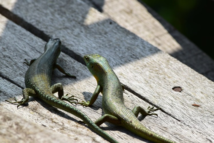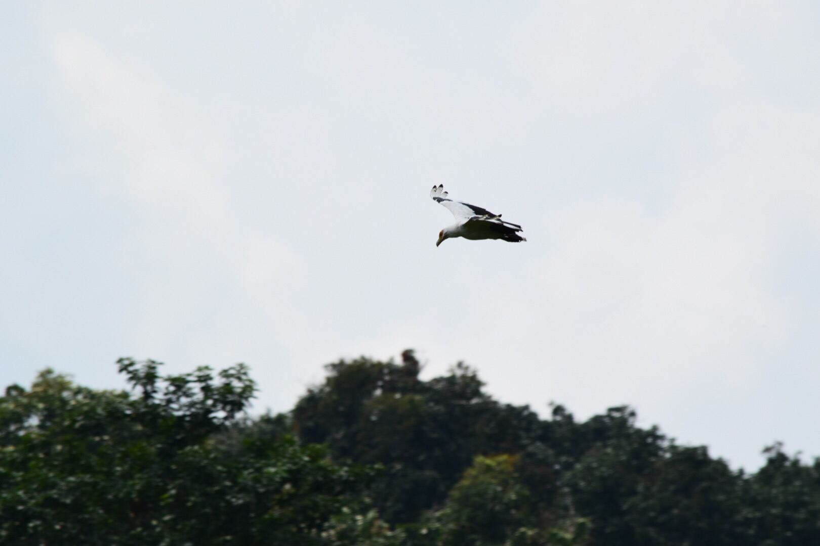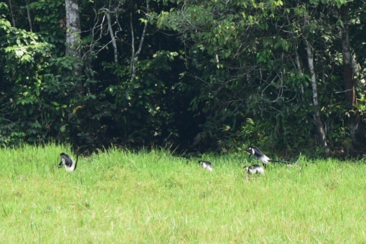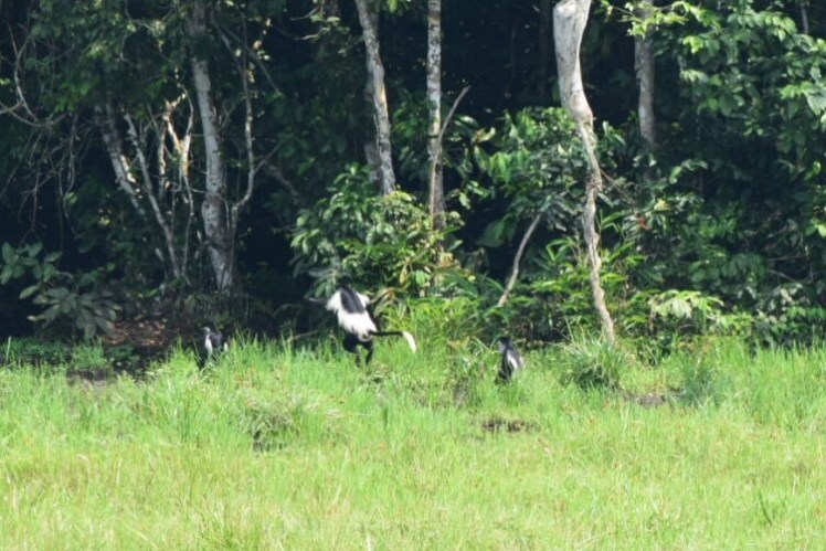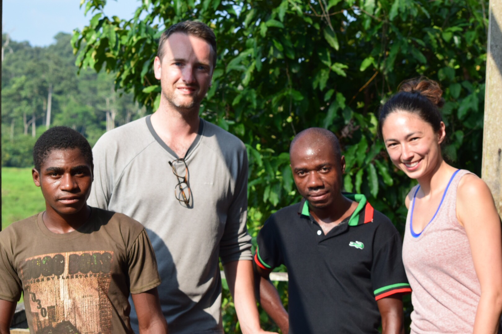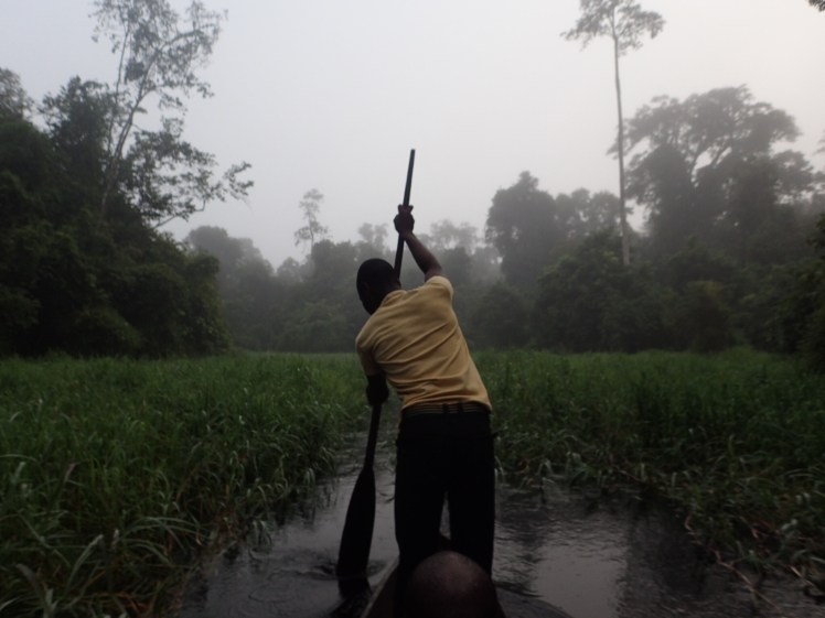 The next morning, we started off bright and early to hitch a ride with some researchers on an hour long drive into the park. Almost immediately we got some wildlife viewing with a solitary gorilla and a family of giant forest hog hanging out in the road.The research director told us we were incredibly lucky and that “researchers are here for months and years and never see anything like this” as she got out to take dung samples. Our good fortune continued throughout our stay.The original plan was to stay near the Bai at Mbeli camp, but a trouble making elephant nicknamed Bart had been wrecking havoc there. He removed the roof of the tourist huts because he enjoyed eating clothes and bars of soap. Plan B was a camp further away at Ndoki which involved an hour long pirogue ride, oared by Ba’aka (the indigenous people of the area), followed by a 45 minute hike to the bai twice a day.This Bart driven turn of events proved fortunate, as our pirogue and forest walks were quite eventful! We saw a horde of red river hog, a few blue duiker (like deer), a couple different monkey groups, and some partridge. Thank you Bart, for your incorrigibility.Over the two days at the Bai viewing platform our luck continued. We saw five elephants, which interestingly are numbered instead of named, unlike gorilla which are given kooky names with a theme for each group. We were hoping these two elephants, finding themselves at the Bai at the same time, would interact more, but they just looked at each other and sprayed some water around.We saw a total of six gorilla families (George, Conan, Morpheus, Bomba, Saha, and Stockwell) plus 2 solitary silverbacks (Louie and Lyle).  This was a boon for Marie and Valerie, the researchers, as they furiously took notes and recorded behaviors. After the dust had settled, Valerie and Marie pointed out and identified the gorilla groups and told us a lot of interesting gorilla information, such as the complicated soap opera of their family lives. Apparently George is starting a commune and Louie needs a woman… bad.Louie creeping on elephant #118.The resident fish eagle.A group of black and white colobus monkeys descended from the trees to feast on bugs and the delicious algae in the Bai. They jumped around.We also were visited by some lizards and innumerable sweat bees (fly-like insects which are attracted to sweat, conjunctiva, nostrils, and are the most irritating things ever). Jesse endured the full swarmy wrath of the sweat bees. Often his sunglasses would be coated in the bastards. The researchers were more Zen about the bees, and some could even be still as they obliviously allowed the insects to crawl across their open eyes. We are not there yet, especially Jen.After a full day viewing the playful and social gorillas from afar, we had a reality check on the way home from the Bai – A close encounter with a gorilla on the pirogue. Imagine, you are in an unstable dugout log, with Ba’aka standing fore and aft. They point out some freshly gnawed water plants and gently whisper “gorilla”, instantly followed by a ferocious bellowing roar from feet away.Here we are with our trackers, Fils and Nakoue. They had supernatural powers spotting and tracking animals randomly in the forest. Next up… the trials and tribulations of jungle living, and gorilla tracking