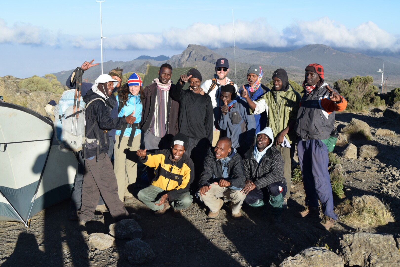 In the morning, we took a group photo with the whole team (including Michael – he was feeling better and continued on): head guide Mathayo, assistant guide Alkard, cook Nicodemas, waiter/porter Chrizostom, and porters Frank, Michael, Roman, Manase, Sadiki, Baraka, and Christopher.