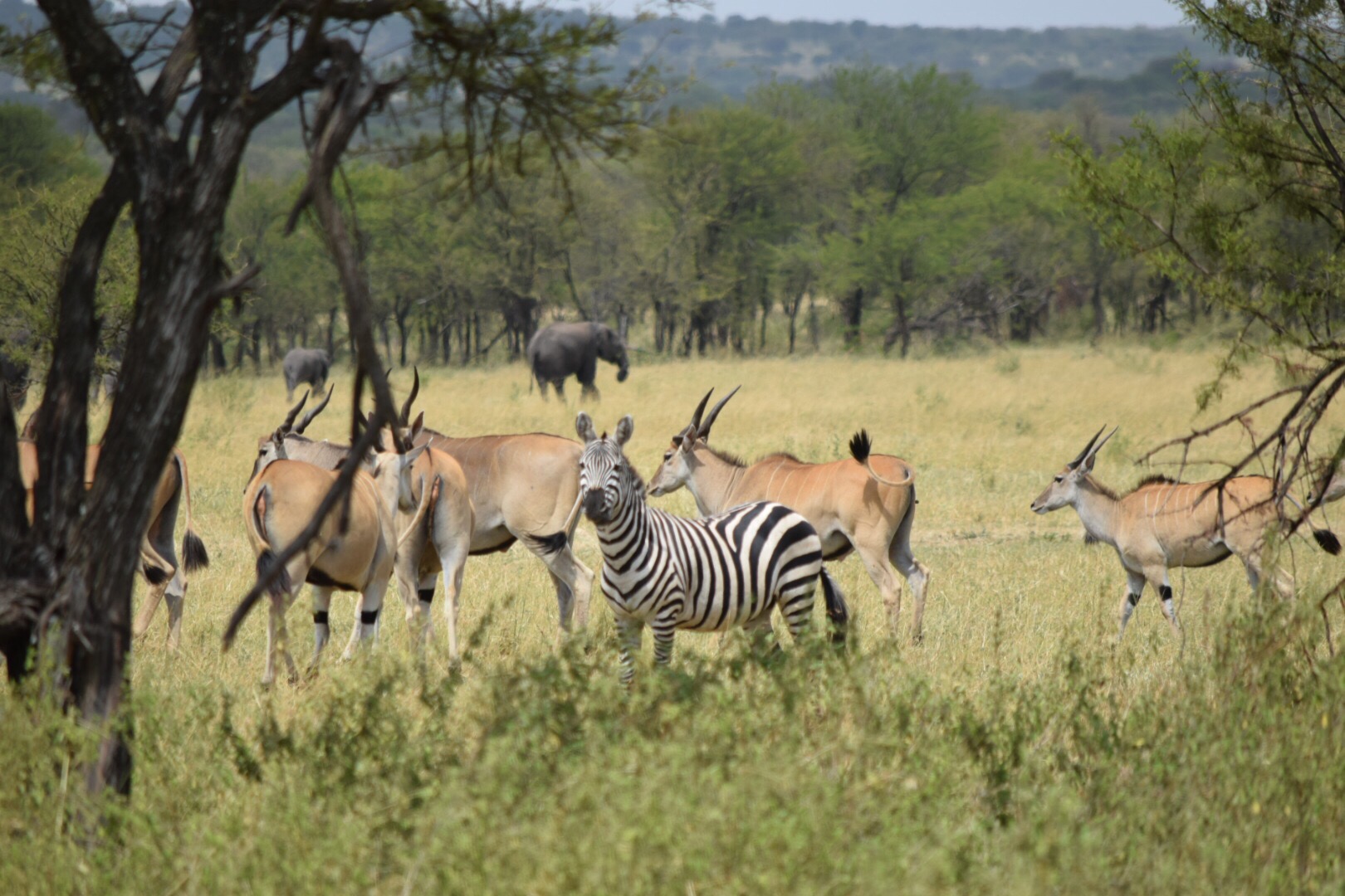 On our drive to the lodge we saw a lot of mingling herds: Here is an alert zebra with some Eland (a gigantic, very shy, and apparently very tasty antelope), with some elephants in the background.