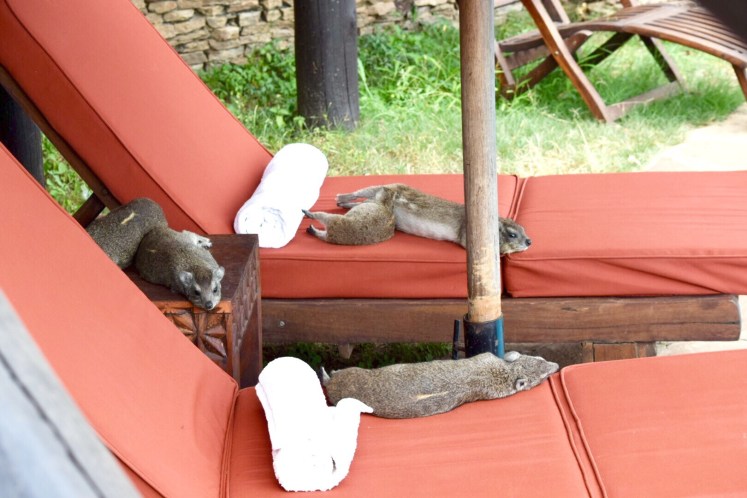 The camp was in the middle of the bush, so there was a lot of wildlife wandering through. There was a river with 60 resident hippos a few hundred yards away, and they often came up and grazed by the tents at night. For this reason (and the occasional leopard), we were not allowed to walk unaccompanied between our room and the main lodge at night, and needed to radio for an escort. There were also some hyraxes (which are actually related to elephants), who liked to lounge by the pool.