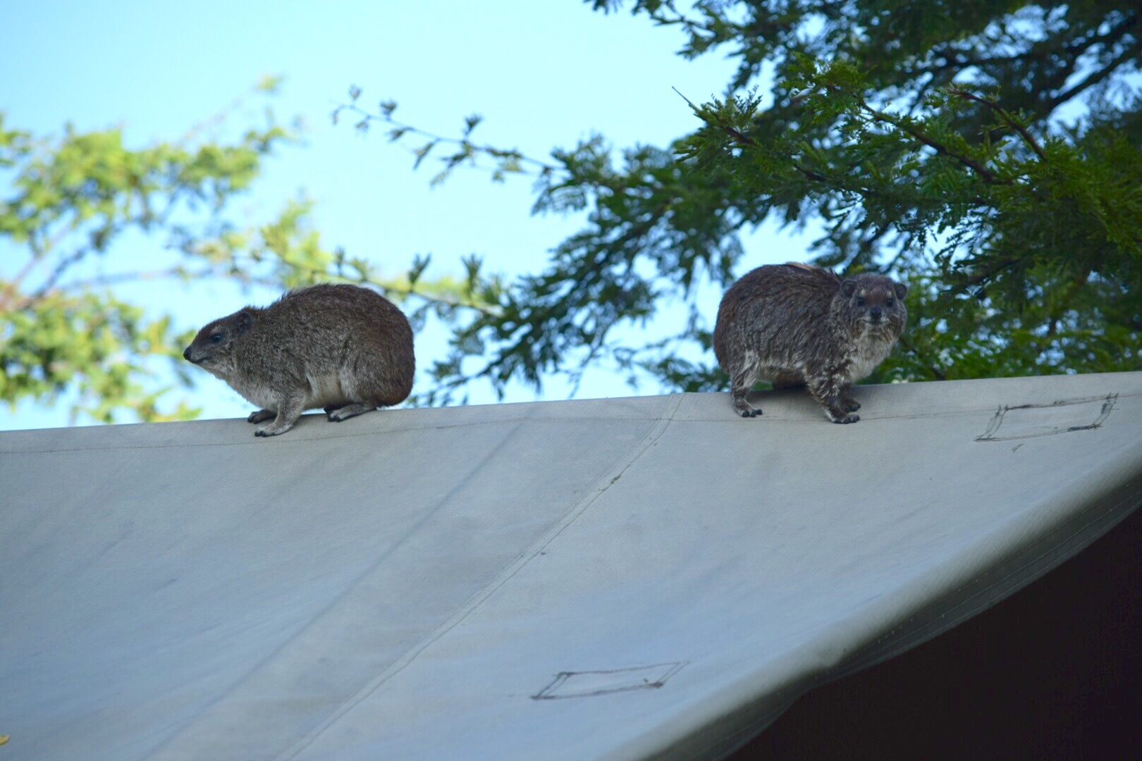 We were used to hearing the hippos tramping around outside our tent from the first night, but that night it sounded like someone was throwing pebbles and scratching our roof all night long. In the morning, it was revealed that these soggy hyraxes were taking shelter in the space between our inner and outer tent throughout the night, incidentally also using it as a toilet.