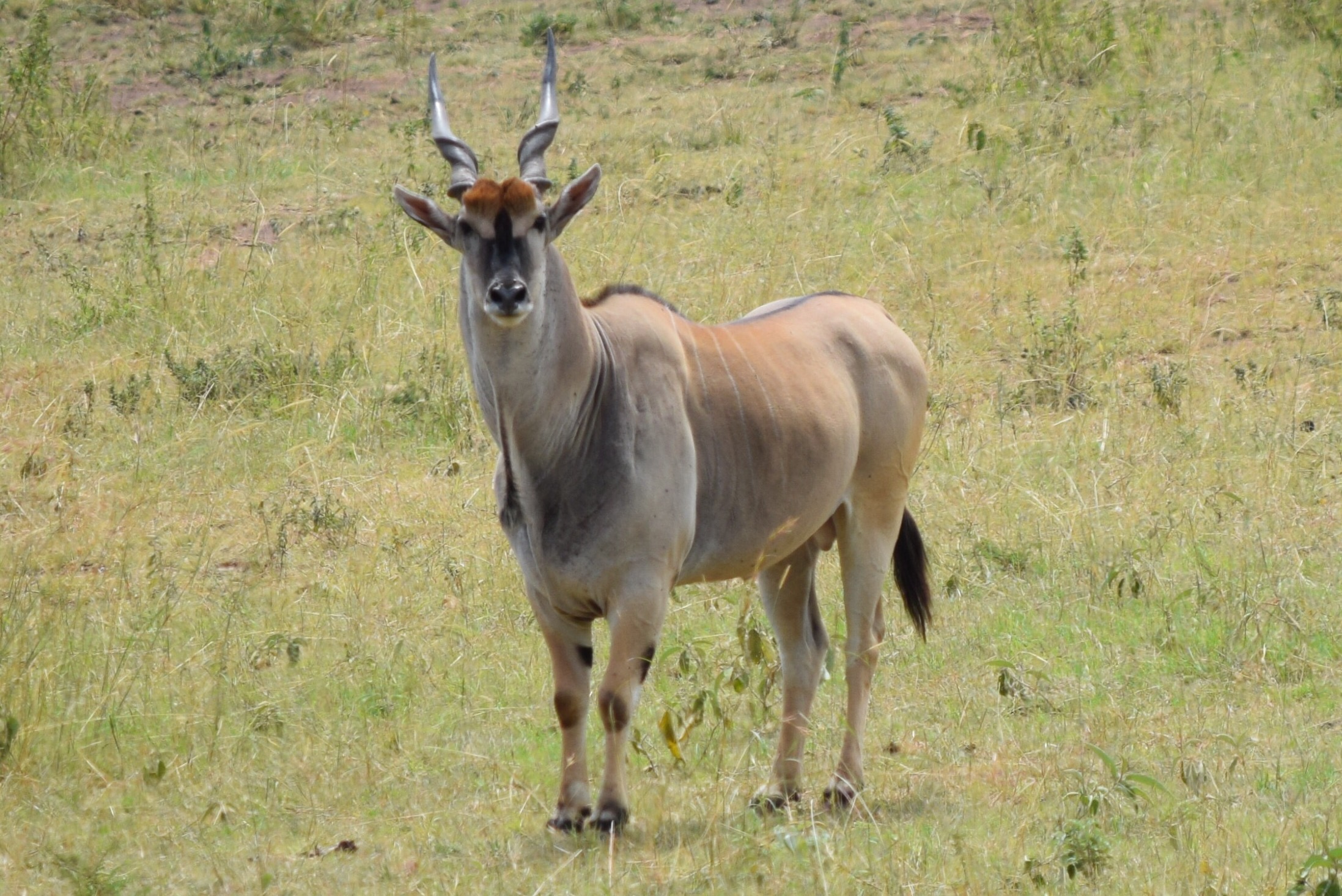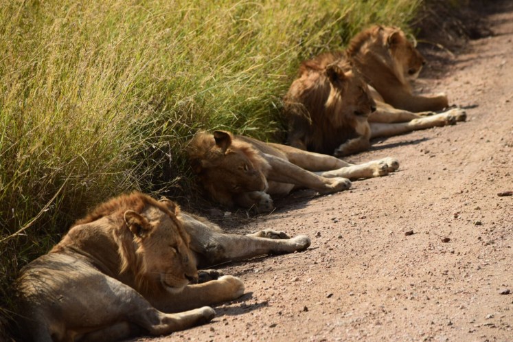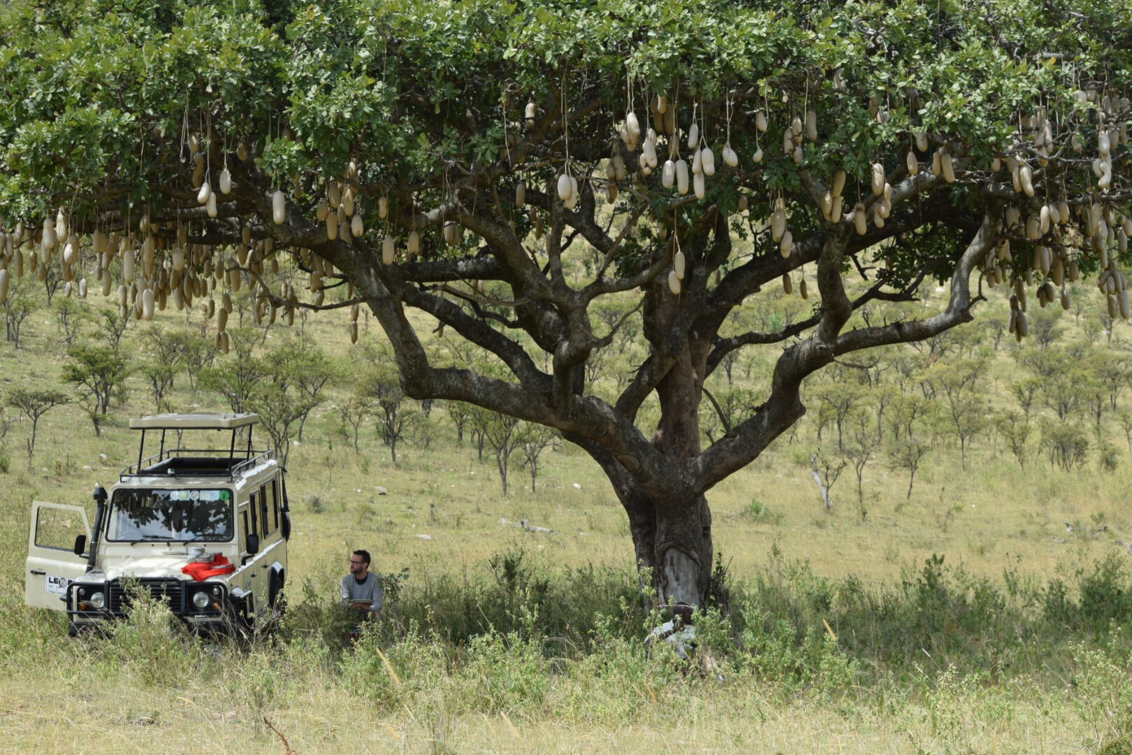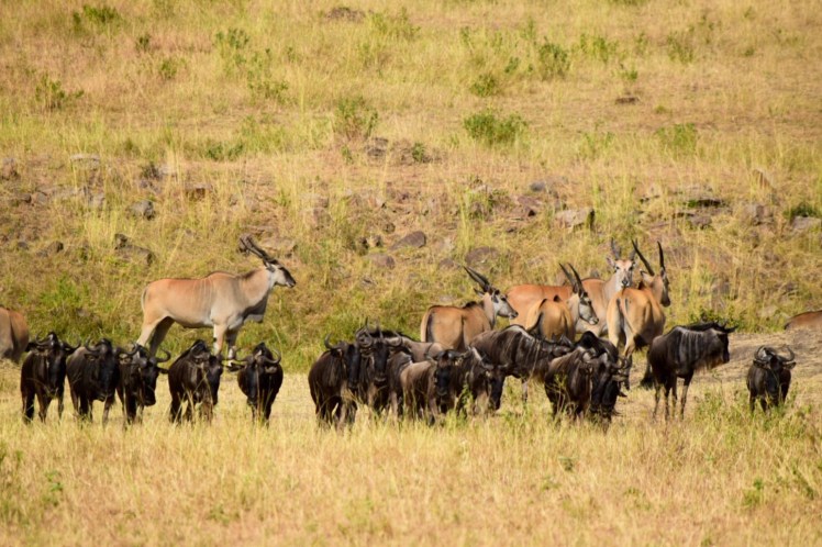 Elephants were probably the easiest, as they were everywhere, were huge and easy to spot, and didn’t seem to mind being near us at all. Here is a large herd taking a mud bath in the middle of the road ahead of us.Ears need cleaning too.One memorable lunch, we stopped to eat under a sausage tree (so named for the seed pods that look like enormous sausage links)…We saw a shy eland come bounding over the hill towards us, becoming completely shocked and terrified as soon as he heard the camera click.Then we saw a herd of over a hundred elephants crossing the plain down below.Cape buffalo are one of the most dangerous animals in the park, according to our guide Max. He told us about a ranger friend of his that was very recently killed by a buffalo. They are responsible for about 200 deaths a year, and can be wily and vengeful in their attacks.They are also ubiquitous. We even saw them within touching distance at the restaurant of the Serengeti Serena (the second place we stayed). At both the Serena and the Migration Camp we had to be accompanied by trained guards to walk to our room after sunset, not only for the buffalo, but for the hippos and leopards as well.We saw quite a few lions as well, including a pair of lions mating. Apparently, lions couple up for 6 days at a time when the lioness is in heat. They get together every 15 minutes the first few days, then every 30 minutes, and by the last couple days they’re down to every hour or so. We caught these two as their romantic interlude was ending, so we waited for awhile while the female lion slept.According to Max, the female decides everything about the timing, and if the male approaches too early and wakes her up, she bites or scratches him. This waiting male lion seemed quite on edge, and charged at a tourist in a neighboring cruiser who was trying to climb on the roof to take a better picture.She finally woke up…And got ready.The female lion then walked over to the male lion and it was all over in about 10 seconds.