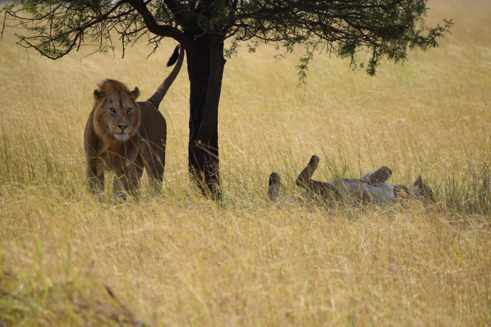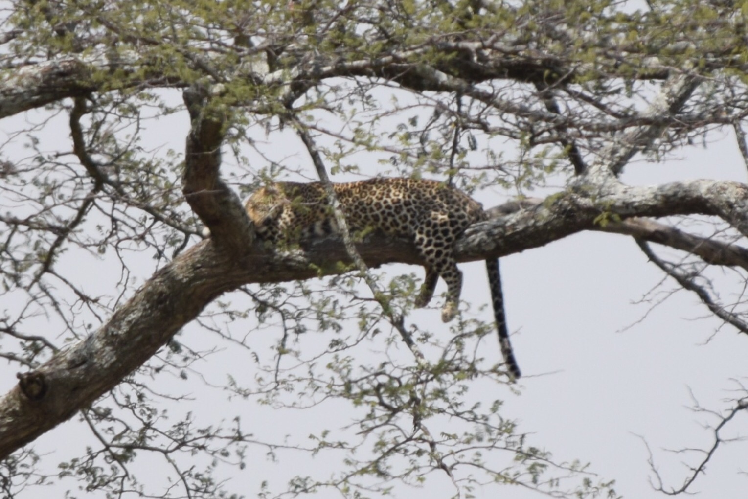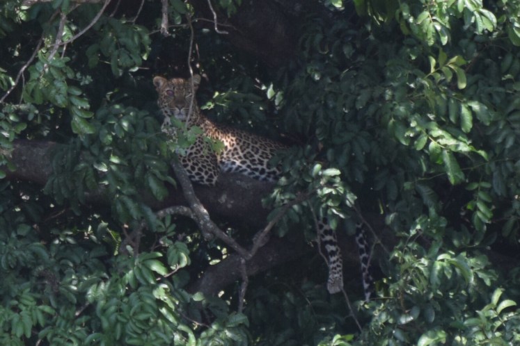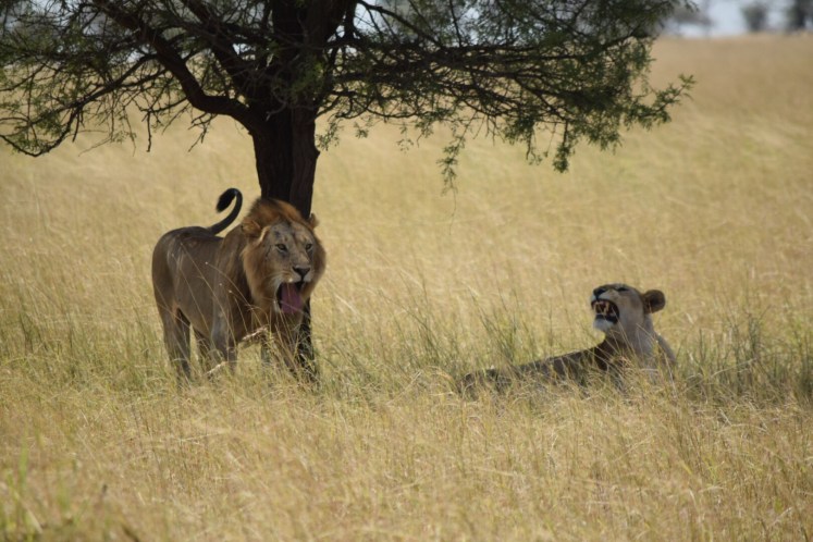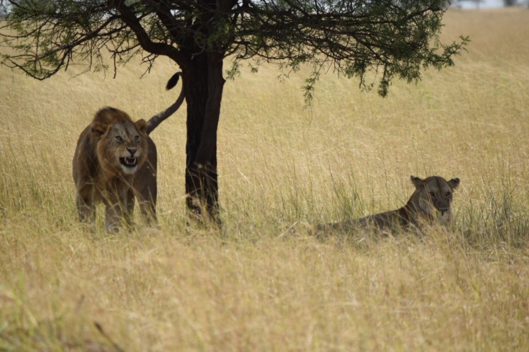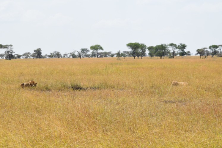 Afterwards she rolled around.He made some yawny faces.And when he tried to walk over and cuddle she got mad at him and found some shade of her own.We also saw a bunch of young male lions hanging out by the side of the road. They must have just eaten, as they were very sleepy and very comfortable with the vehicles.One of the more difficult animals to see was the black rhino, in part because they’re critically endangered. We were lucky and saw this beautiful lady early on in the trip.The rhinos are protected by armed rangers, and they had to be repopulated from South Africa several years ago. Luckily, there have not been any deaths by poaching within the last year.Leopard was by far the toughest to find, as they are mostly active nocturnally and lie around well camoflaged in trees during the day.  Spotting one is all about pattern recognition. Here is one that we finally found across a stream, and this is with 300mm zoom!A beautiful animal, his right eye was damaged and pink – my guess is ruptured globe secondary to claw injury.We saw a second leopard minutes after finding the first. Just in time, as we were on our way to Ngorongoro crater, where leopards are much rarer. Next post – the crater and the Masai!