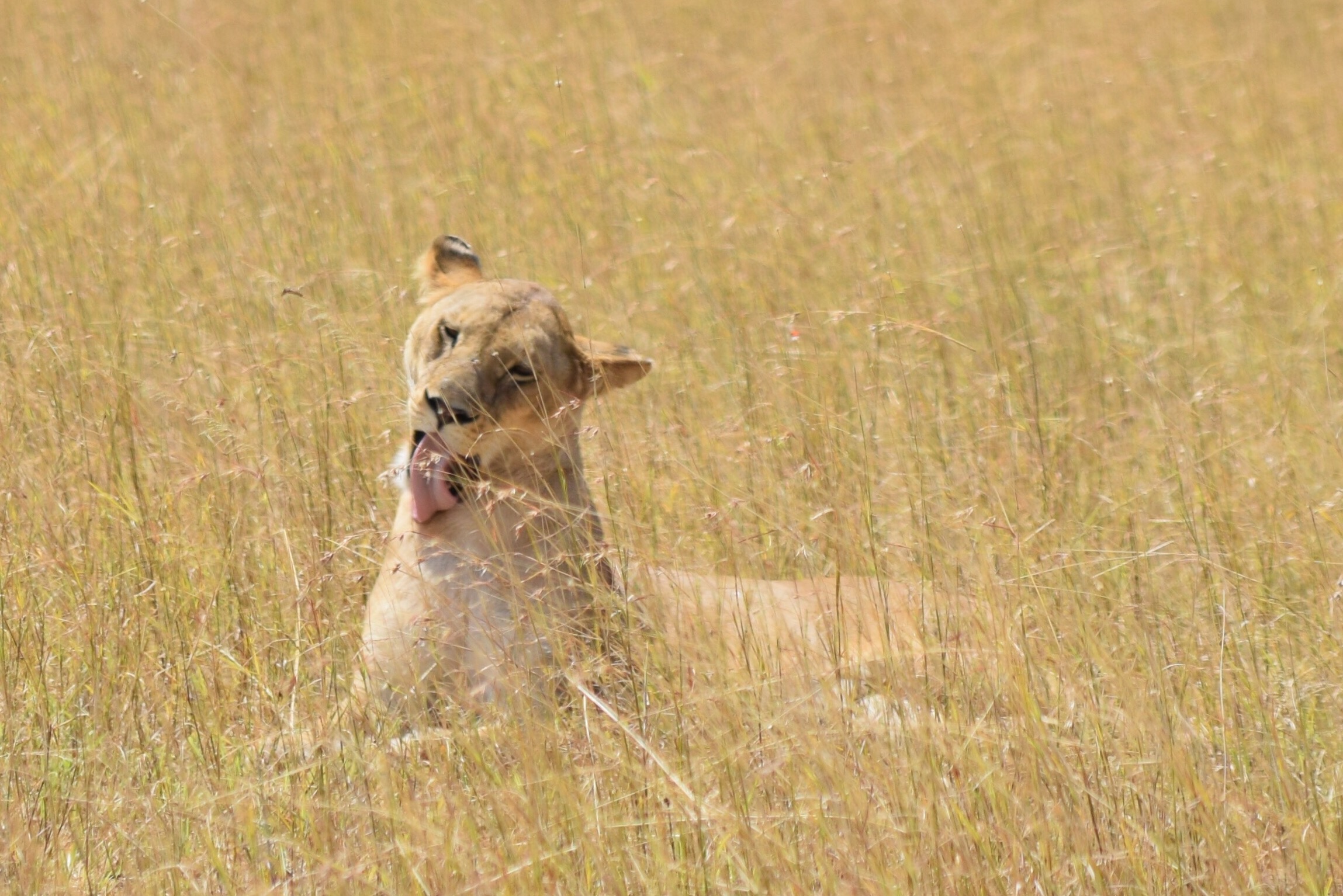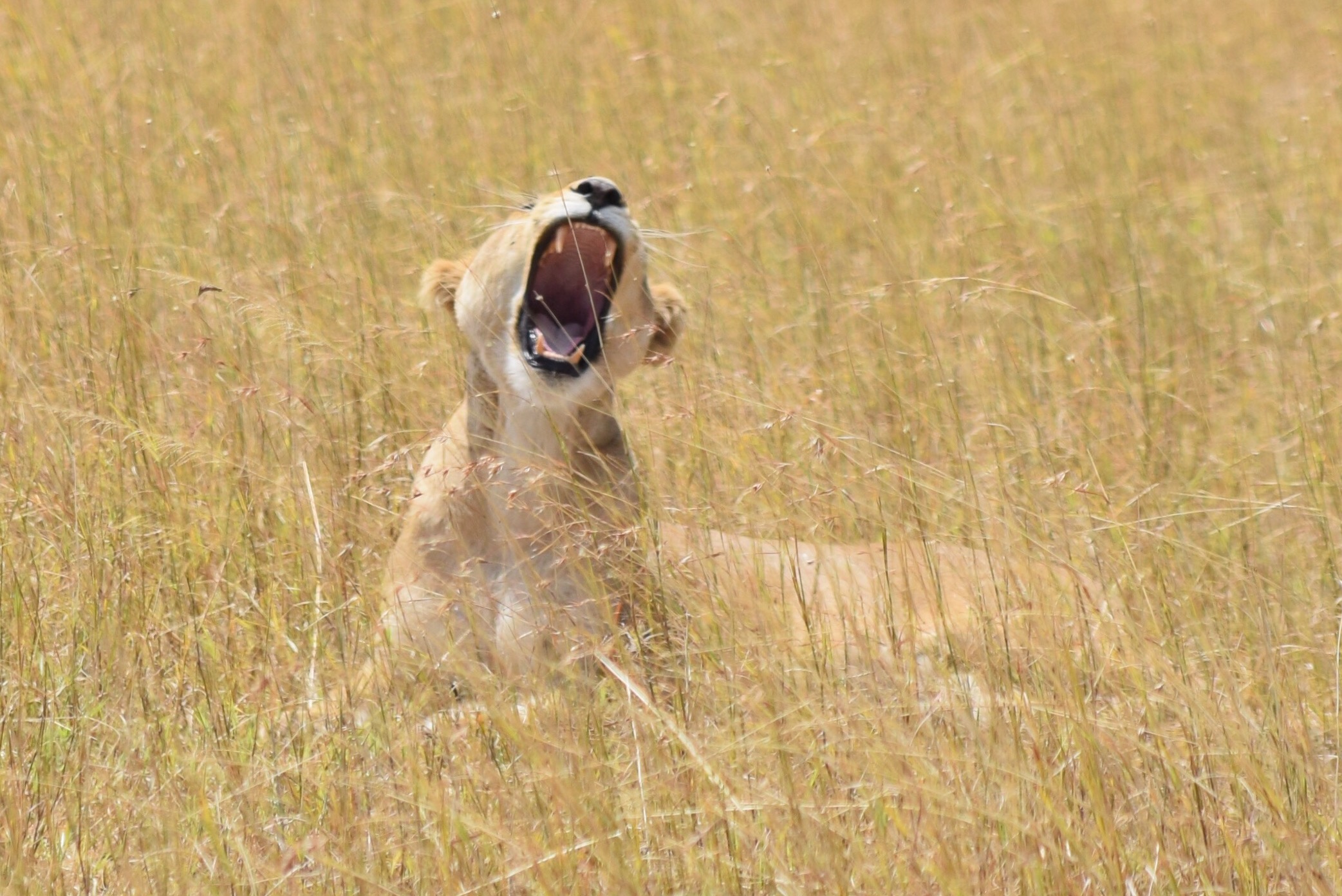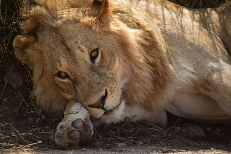 Afterwards she rolled around.He made some yawny faces.And when he tried to walk over and cuddle she got mad at him and found some shade of her own.We also saw a bunch of young male lions hanging out by the side of the road. They must have just eaten, as they were very sleepy and very comfortable with the vehicles.One of the more difficult animals to see was the black rhino, in part because they’re critically endangered. We were lucky and saw this beautiful lady early on in the trip.The rhinos are protected by armed rangers, and they had to be repopulated from South Africa several years ago. Luckily, there have not been any deaths by poaching within the last year.Leopard was by far the toughest to find, as they are mostly active nocturnally and lie around well camoflaged in trees during the day.  Spotting one is all about pattern recognition. Here is one that we finally found across a stream, and this is with 300mm zoom!A beautiful animal, his right eye was damaged and pink – my guess is ruptured globe secondary to claw injury.We saw a second leopard minutes after finding the first. Just in time, as we were on our way to Ngorongoro crater, where leopards are much rarer. Next post – the crater and the Masai!