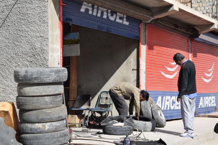 The drive out to Tso Moriri would take 6 hours. We got off to a slow start, blowing out a tire on a little side road we had to take because the main one was flooded. Luckily “tyre” shops pepper the main roads and in 20 minutes the tyre was patched and repaired.