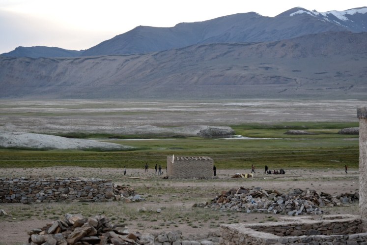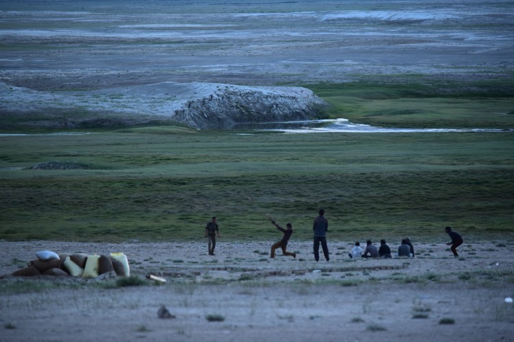 As we watched a pickup game of cricket on the salt flats of Tso Kar. The drying lake has left salt/sulphur drifts that look like glaciers. The local villagers harvest and sell these minerals.