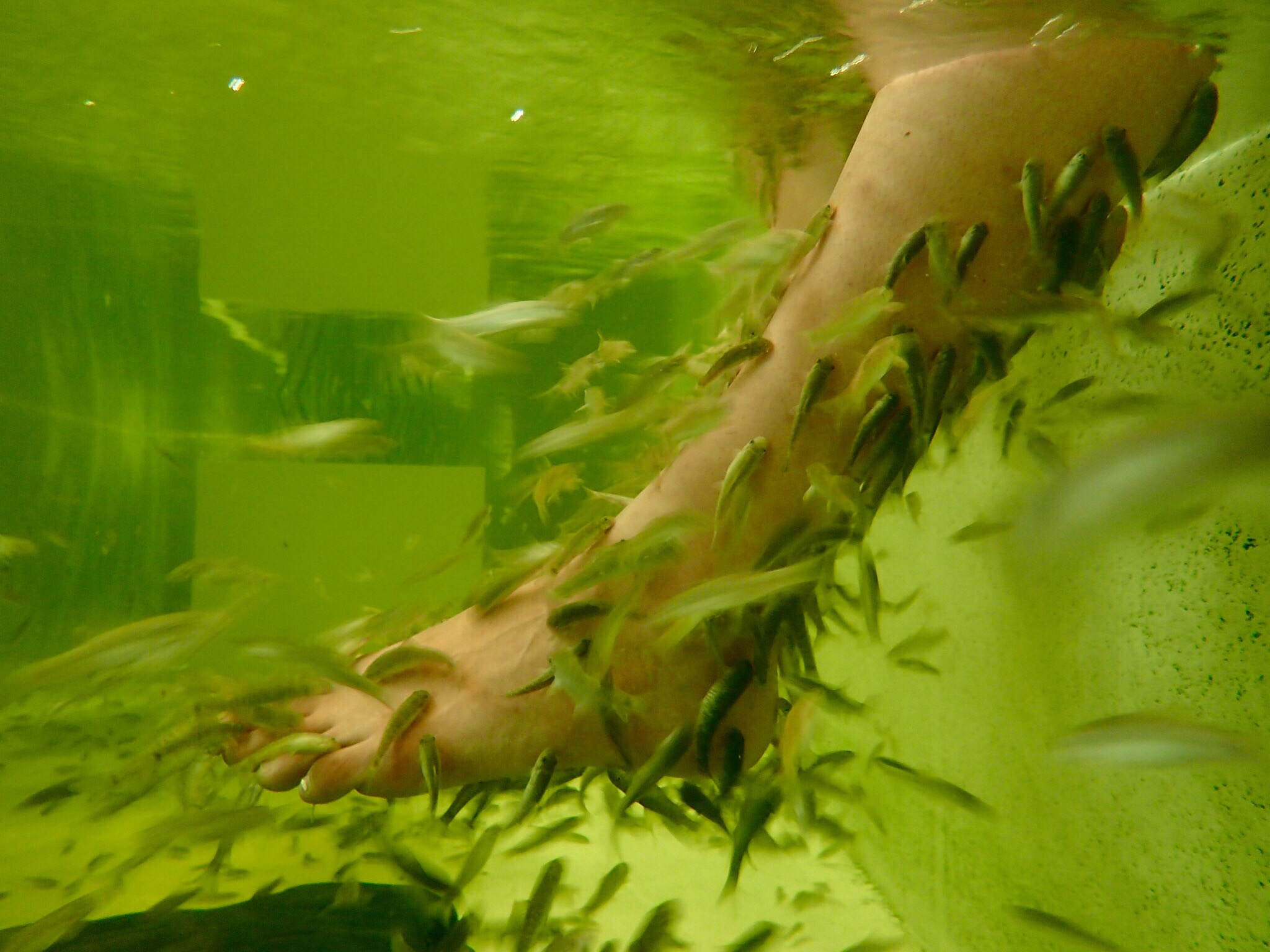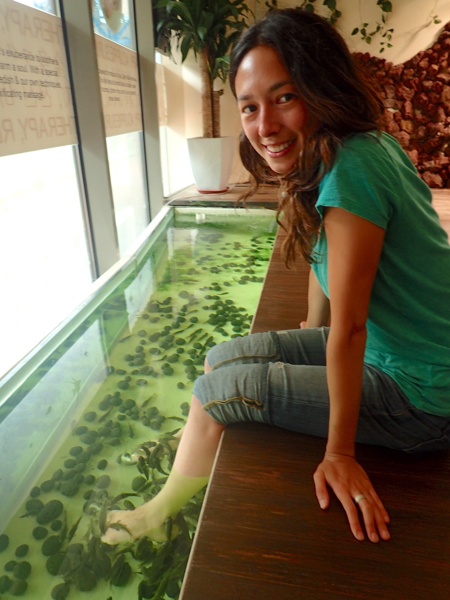 After the views, Jen got all the trekking calluses on her feet cleaned up by some fish, her first “fish massage”.