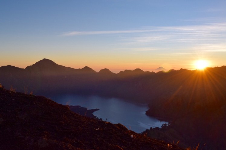 We decided to use Jesse’s favorite technique – not making any decision until the very last possible second. After a few days of civilized recovery in Singapore, we flew into Mataram and made our way to Rinjani Lodge, where we got a beautiful sunset glimpse of the peak (the curved point just to the right of the edge of the infinity pool). It didn’t look nearly as intimidating as the snow capped crags we had become used to seeing.