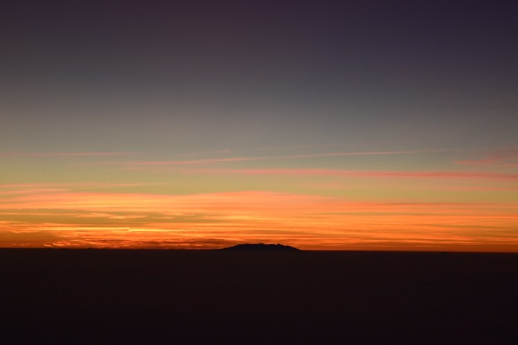 There was no wind as we sat at the top in the quiet and stillness (in between camera clicks and occasional whoops of joy/relief from other climbers reaching the top), enjoying the gradual brightening of the pastel Monet sky into a late dawn glow.