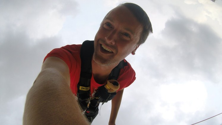 In no time I had paid my fare, was harnessed, and had inched my way to the edge of a plank 233 meters high, over 750 feet. At the time I felt calm but if you look hard at this picture, you’ll notice my white knuckles.