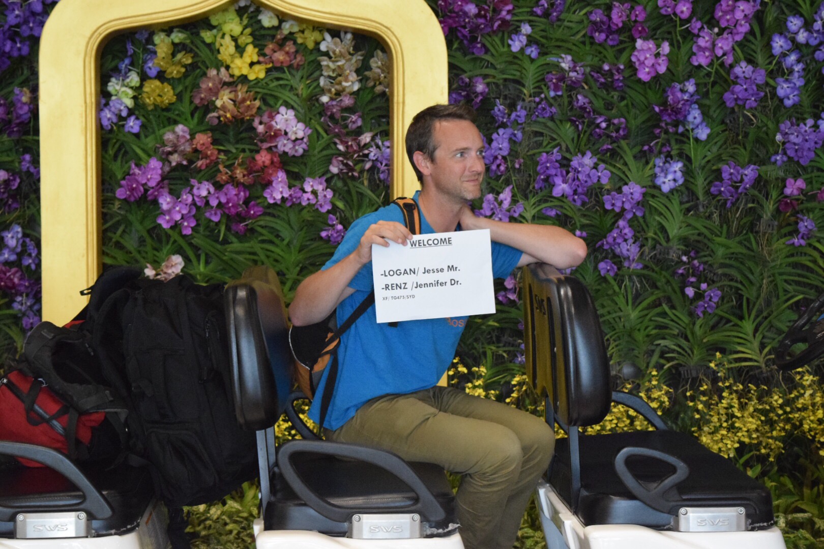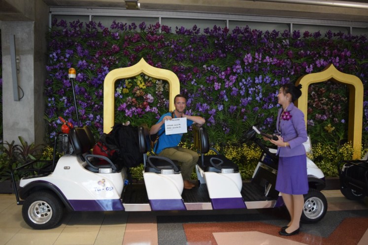 We flew first class on Thai Air to Sydney via Bangkok (thanks to my miles). Among hardcore travelers there is an important distinction between business class and first class. As business class veterans at this point in our trip, we were surprised to be accosted on our arrival to Bangkok by a purple suited lady carrying a sign with our names on it. She whisked us away to the first class lounge on the old people cart. I guess they heard it was my birthday.